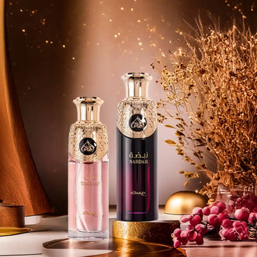 Experience the captivating allure of Nabdah with Taaraat, a 200ML duo crafted for both men and women. Nabdah for men blends rich vanilla, musk, and myrrh with bold notes of passionfruit and oud, resting on a warm base of saffron and magnolia for a profoundly masculine scent. Taaraat for women combines animalic musk and saffron with soft rose and osmanthus, finishing with elegant bergamot and cashmere wood. Together, they offer a harmonious balance of strength and sophistication, perfect for those who desire a fragrance that commands presence and leaves a lasting impression.